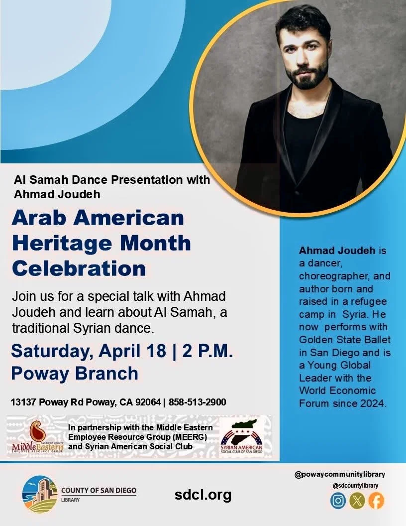 We are celebrating Arab American Heritage Month with an Al Samah dance presentation. Join us on 4/18 at 2 p.m. when Ahmad Joudeh will be talking about the history of this traditional Syrian dance.